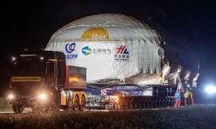 Trotz aller politischen Wirren, die gegenwärtig die Welt erschüttern, geht – ähnlich wie bei der ISS - die Arbeit am Fusionsreaktor ITER, an dem zahllose Nationen beteiligt sind, weiter. Dieser Tage wurde per Schwertransport ein weiteres der jeweils 15 m hohen Segmente für die künftige Plasmakammer angeliefert.